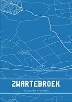Blauwdruk van de landkaart / plattegrond van de Nederlandse plaats Zwartebroek, gelegen op de Veluwe, in gemeente Barneveld, provincie Gelderland. De kaart bevat alle openbare wegen en de coördinaten van het centrum van Zwartebroek.