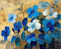 Blauwe Bloemen Pracht | Moderne Bloemenkunst - Het doek toont een charmante aaneenschakeling van bloesems in intrigerende blauwe en witte tinten, die van het canvas lijken te dansen tegen een achtergrond met een gouden glans. Deze compositie balanceert sierlijke floralen met een ruwe textuur, wat een moderne interpretatie van klassieke bloemstukken biedt, ideaal ter aanvulling van een hedendaags interieur met een vleugje klassieke elegantie.