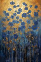Dit werk toont een groep blauwe bloemen die lijken te zweven in een achtergrond van goud en diepblauw. De bloemen lijken te baden in het laatste licht van de dag, wat een magische, bijna etherische sfeer creëert. De gouden tonen bovenin vervagen geleidelijk in het diepe blauw, wat een gevoel van diepte en beweging geeft. Dit stuk straalt een rustige en dromerige energie uit, perfect voor een slaapkamer of een rustige leeshoek waar het een kalmerende invloed kan hebben.