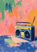 Dit expressieve schilderij toont een blauwe boombox in het midden, geaccentueerd door gouden details en twee opvallende zwarte luidsprekers. Een geel zijelement met lijnen en een schuine antenne versterken het retro karakter. De boombox staat op een blauw geschilderd oppervlak met gedurfde, zichtbare penseelstreken. De achtergrond is…