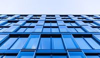 Moderne gebouwgevel in glas en staal, blauw getint, minimalistische gebouwarchitectuur, Düsseldorf Media Harbour