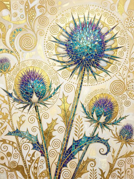 Blauwe Distels van Stilte verenigt contrasten die elkaar versterken: scherpte en zachtheid, bescherming en openheid, weelde en rust. De distel – vaak gezien als stekelig en ongenaakbaar – wordt hier verheven tot een bijna koninklijk motief. Uitgevoerd in diepe blauwtinten, turkoois en bladgoud krijgt de plant een nieuwe identiteit: niet…