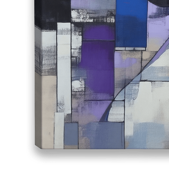Blauwe Droom | Vrouw Blauw - Dit is een modern vrouwenportret schilderij getoond in een pallet van voornamelijk blauwe en paarse tinten, waar de vrouw wordt gepresenteerd met een artistieke, blauwe hoofdbedekking en subtiele abstracte achtergrond.