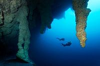 Duikers verkennen het mystieke onderwaterlandschap van Blue Hole Belize op 45 meter diepte.