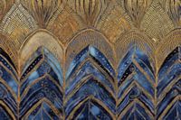 Dit werk toont een gedetailleerd patroon van boogvormige segmenten in verschillende tinten blauw en goud. De bovenste helft bestaat uit goudkleurige geometrische lijnen en patronen, terwijl de onderste helft overgaat in diepblauwe tinten met spiraalvormige details. De boogvormen creëren een herhalend en harmonieus geheel dat doet denken aan art deco en jugendstil stijlen.