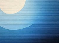 Blauwe Halve Maan - Dit abstracte schilderij toont een groot, dominant wit halfrond element tegen een achtergrond met een zacht kleurverloop van licht naar donkerblauw, waarbij het patroon subtiel horizontale lijnen bevat.