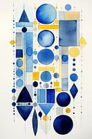 Blauwe Harmonie - Geometrische vormen in zachtere en gedurfde blauwe tinten worden versterkt door accenten in gouden en neutrale kleuren, waarbij lijnen en stippen een subtiele verbinding suggereren. Het spel van transparantie en overlappende vormen geeft een gevoel van diepte op het vlakke canvas, waarmee een abstract, modern gevoel…