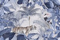 Tijger en toekan met tropische vegetatie en historische kaart in blauwe kleuren, ideaal voor natuurliefhebbers, avonturiers, reizigers en ontdekkingsreizigers