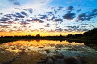 Prachtige zonsopgang met reflectie en een vlucht ganzen in Natuurpark 'De Blauwe Kamer' in Wageningen
