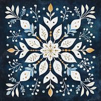 Blauwe Kerst - Dit kerst schilderij toont een symmetrisch ontwerp met sneeuwvlokachtige vormen, gemaakt uit bladeren, bessen en bloemen, voornamelijk in de kleuren wit, goud, blauw en wat beige, tegen een diepblauwe achtergrond.