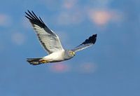 Mannetje Blauwe Kiekendief vliegend voor een blauw gekleurde berghelling in Italie.