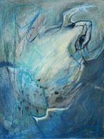Olieverf en oliepastel op canvas van een blauwe kikker met een blad.