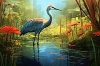 Blauwe Kraanvogel - Dit fraaie kunstwerk portretteert een elegante kraanvogel, rustig wadend door het water omgeven door rustgevende blauw- en groentinten, wat een natuurlijke en serene atmosfeer oproept. De stijl doet hedendaags aan met een vleugje impressionisme, terwijl de zachte oranje bloemen op de voorgrond een mooi contrast bieden.