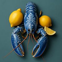 Een moderne interpretatie van Hollandse traditie: een Delfts blauwe kreeft gecombineerd met frisse citroenen tegen een heldere blauwe achtergrond. Dit kunstwerk straalt elegantie uit en brengt kleur in een eigentijds interieur – perfect voor de keuken of eetkamer.