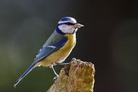 Een Blauwe Mees met een zonnebloemzaad in zijn snavel
