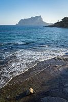 Het natuurpark Peñón de Ifach, blauw zeewater, zachte golven en een kleine baai in Calpe. Het landschap baadt in subtiele blauwtinten.
