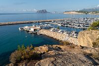 Uitzicht op de jachthaven van Moraira en de Middellandse Zeekust. Reisbestemming Costa Blanca in Spanje. Ik hou van een uitkijkpunt in Moraira, gelegen aan de betoverende baai genaamd Cala del Portitxolet. Vanaf de verhoogde positie boven de kliffen heeft u een prachtig uitzicht op de kustplaats Moraira, de mooie jachthaven en de witte zeilboten. Afhankelijk van de weersomstandigheden verschijnt het zeewater daar in de kleuren blauw en turkoois.