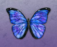 Een aquareltekening van een blauwe morpho, of de morpho menelaus. Een vlinder die voorkomt in Midden en Zuid Amerika en je veel tegenkomt in vlindertuinen. De vlinder is afgebeeld met zijn blauwe glimmende vleugels naar boven, zijn vleugels zijn uitgespreid waardoor er symmetrie ontstaat. De vlinder is ingekleurd met verschillende blauw…