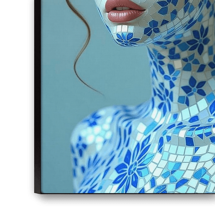 Dit is een opvallend en surrealistisch portret van een jonge vrouw, gedomineerd door intense blauwtinten en een fascinerend mozaïekpatroon. Haar gezicht en hals zijn versierd met een complex ontwerp van blauw en wit tegelwerk, dat sterk doet denken aan de patronen van het traditionele Delfts blauw of Portugese azulejos. Delen van haar huid zijn zichtbaar door de lichte 'voegen' van het mozaïek, wat een gevoel van kwetsbaarheid en diepte creëert. Haar doordringende blauwe ogen matchen de kleur van de hoofdbedekking en de mozaïek, en trekken onmiddellijk de aandacht.
