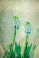Kleine fijne bloemen van druifhyacint in lichtblauw, groen en wit. Een lenteboot in een romantisch ontwerp. Bloemen delicaat en vol van schoonheid.