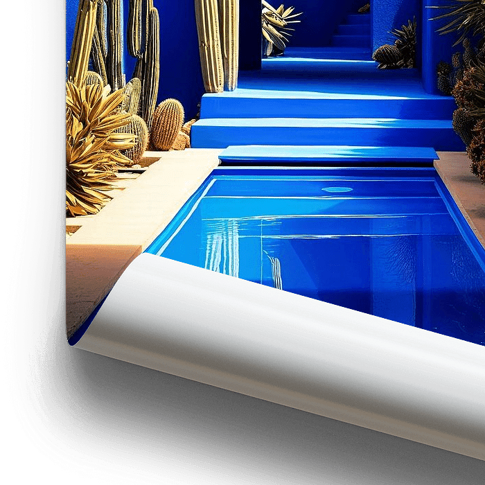 Dit kunstwerk nodigt uit tot contemplatie door de krachtige visuele impact van het levendige kobaltblauw dat de muren en de trap van deze serene tuin bedekt.