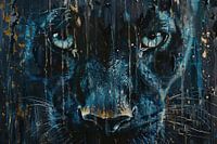Dit werk toont een indringende close-up van een zwarte panter. De ogen, fel en gefocust, trekken onmiddellijk de aandacht en stralen kracht en mysterie uit. De achtergrond is donker met subtiele blauwe en gouden accenten die de panter nog imposanter maken. De gedetailleerde weergave van de vacht en snorharen voegt een extra laag van realisme toe, terwijl de abstracte elementen rondom de panter een spannende sfeer creëren.