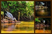Grijze reiger collage, een verzameling van drie foto's gebaseerd op mijn originele foto's van een reiger op jacht in een meer. Terwijl ik toekeek, begon de reiger in het modderige water naar voedsel te zoeken en kon duidelijk beweging onder het oppervlak zien. Toen de zon opkwam begon hij zich uit te strekken naar het water van het…