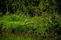 Een Blauwe Reiger bij een sloot is niet vreemd, maar een reiger op een tak boven de sloot zie je niet iedere dag. Tenminste ik niet. Deze Blauwe Reiger vindt het kennelijk een plek met goed overzicht. Met al het groen en de bloemen er omheen is het een mooi werk voor aan de muur.