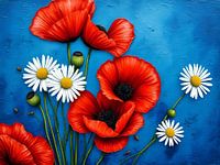 Een levendig digitaal schilderij met een tros scharlakenrode klaprozen en delicate witte margrieten tegen een gestructureerde, azuurblauwe achtergrond. Het gedurfde rood van de klaprozen, met hun donkere hart, contrasteert prachtig met het pure wit en zonnige geel van de madeliefjes. De compositie creëert een levendige en vrolijke…