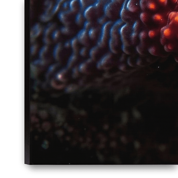 In deze prachtige muur canvas zie je het Vuurkoraal, met haar indrukwekkende en kleurrijke uiterlijk, die een betoverende blauwe stroom achtige signalen afgeeft. Dit kunstwerk is geïnspireerd door de adembenemende schoonheid van de zee en haar bewoners.
