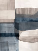 Dit abstracte werk speelt met structuren en kleuren in koele tinten van blauw en grijs. De lagen creëren een gevoel van diepte, terwijl de combinatie van vormen en lijnen een rustig maar intrigerend beeld geeft.