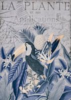 nostalgische kunstcollage met tropische vogel en exotische bloemen in blauwe pastelkleuren