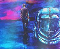 Aquarel van een blauwe Volkswagen. De man loopt weg van zijn auto, is hij kapot of komt hij thuis? Het is nog donker maar de zon komt op. Het licht schijnt een beetje op de VW en laat haar glanzen. Het is een oud type VW met de gescheiden raampjes. Onze eerste auto was ook zo'n blauwe VW die heel wat keertjes het niet deed! Het is voor mij dan ook een beetje nostalgie .