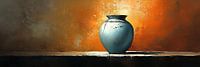 Blauwe Vaas | Azure Solitude - Dit stilleven schilderij toont een prominent geplaatste blauwe vaas tegen een levendige achtergrond met oranje en bruine tinten waardoor een contrast van rust en dynamiek wordt gecreëerd.
