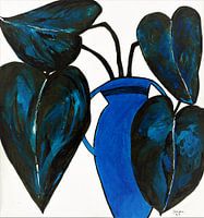 Handgeschilderde aquarel van abstracte blauwe bloemenvaas met zwart blauwe plantenbladeren . Geïnspireerd  door Japand,  dit is  een  gecombineerde Japans- Scandinavische stijl, abstract figuratief met weinig kleur. De grote blauw zwarte bladeren en vaas zijn als een lijntekening  getekend. Past mooi in een modern interieur.