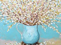Blauwe Vaas - Dit bloemen schilderij toont een prachtige blauwgekleurde vaas vol met lichte, met bloemen bedekte takken die een frisse en vrolijke sfeer oproepen, perfect voor een modern interieur.
