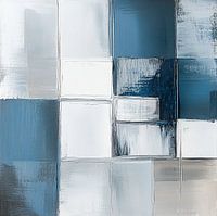 Blauwe Vierkanten | Cool Depths of Serenity - Dit abstracte schilderij vertoont een indrukwekkend spel van overlappende vierkanten en rechthoeken, gedomineerd door een pallet van blauwe en witte tonen, met subtiele schakeringen die diepte en textuur toevoegen.