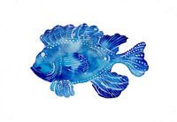een decoratief aquarel kunstwerk van een blauw gekleurde vis in een primitieve tribale tatoeage stijl.