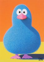 Blauwe Vogel - Dit dieren schilderij toont een humoristisch blauw vogelachtig wezen met een pluizig uiterlijk en grote witte ogen tegen een oranje achtergrond, wat een speels en opvallend visueel effect creëert.