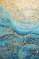 In dit werk zien we een rustgevende voorstelling van golven in verschillende tinten blauw, omlijst door delicate gouden accenten. De bovenkant van het werk toont een lichte, luchtige sfeer met zacht glooiende wolken die neerdalen naar de diepten van de blauwe zee. De gouden patronen die door de golven heen lopen, geven een gevoel van elegantie en verfijning. Dit werk brengt een kalmerende sfeer in elke ruimte, ideaal voor een slaapkamer of studeerkamer waar men tot rust kan komen. De combinatie van blauw en goud voegt een vleugje luxe toe aan het interieur.
