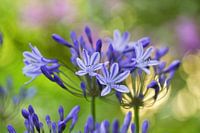 Een foto van blauwe Agapanthus / Afrikaanse lelie bloemen in een kleurige omgeving.groen roze en blauw in de achtergrond maken deze foto een kleurig geheel. Mooi als tuinposter.