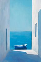 Een zachte overgang van stralend wit naar de diepe, rustgevende blauwtinten van de zee nodigt de kijker uit. Een eenzame, eenvoudige boot buigt zachtjes in het water, terwijl de muren van een smal steegje uitzicht bieden op dit vredige tafereel. Licht en schaduw smelten hier samen in perfecte harmonie.