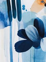 Abstracte vormen in verschillende tinten blauw en een vleugje oranje creëren een rustige, vloeiende compositie. Druppels en brede streken geven het stuk dynamische beweging.