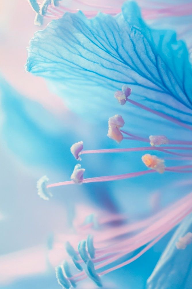 Zachte golven van delicaat blauw ontvouwen zich en wikkelen de kijker in een sprookjesachtige wereld. De filigrane bloemblaadjes lijken te gloeien in het licht, terwijl de glinsterende meeldraden op delicate penseelstreken lijken. Er hangt een vleugje magie in de lucht, alsof de natuur zelf een betoverende droom aan het weven is.