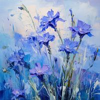 Blauwe bloemenveld, een kunstwerk voor aan de muur. In dit schilderij wordt een weelderig bloemenveld met verschillende tinten blauw op een levendige wijze tot leven gebracht. De expressieve penseelstreken en de diepe blauwe achtergrond geven het geheel een dynamisch, bijna impressionistisch gevoel.