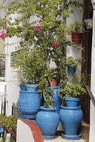 Blauwe bloempotten voor een huisje in Frigliana, Andalucia, Spanje.