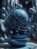 Dit kunstwerk is een complex samenspel van geometrische vormen, waarbij zwevende blauwe bollen centraal staan. De vloeiende lijnen en bogen die de bollen omcirkelen creëren een dynamisch en bijna futuristisch geheel. Het kunstwerk toont een interessante mix van abstracte en moderne kunststijlen, met invloeden van kubisme en futurisme. De strakke lijnen in combinatie met de ronde vormen zorgen voor een balans tussen orde en chaos, terwijl de monochrome blauwe tinten een gevoel van rust en diepte oproepen.