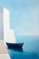 Het water glinstert in zachte blauwe tinten als een spiegel van de oneindige uitgestrektheid. Een smalle steiger leidt naar een eenzame, gestileerde bootgenoot, die blijft hangen in een harmonieuze artistieke stijl. De eenvoudige, witte muren lijken de rust en sereniteit van dit landschap te benadrukken, terwijl de lucht met zijn zachte kleurschakeringen uitnodigt om te dromen.