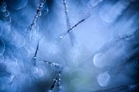 Druppels op het wildemanskruid, zover uit focus dat het geheel abstraheert. Slechts enkele druppels zijn in focus waardoor een surrealistisch effect ontstaat. Het bokeh van de Helios lens, een oud Russisch objectief brengt een unieke sfeer in het beeld.