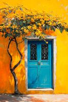 Een stralend gele kleur omarmt een levendige, hemelsblauwe deur versierd met sierlijke rasterelementen. Een kronkelige boom nestelt zich erboven, de gouden bloesems schitteren in volle pracht en dansen speels in het zonlicht. Dit decor straalt warmte en gastvrijheid uit, alsof het je uitnodigt om op ontdekkingstocht te gaan.